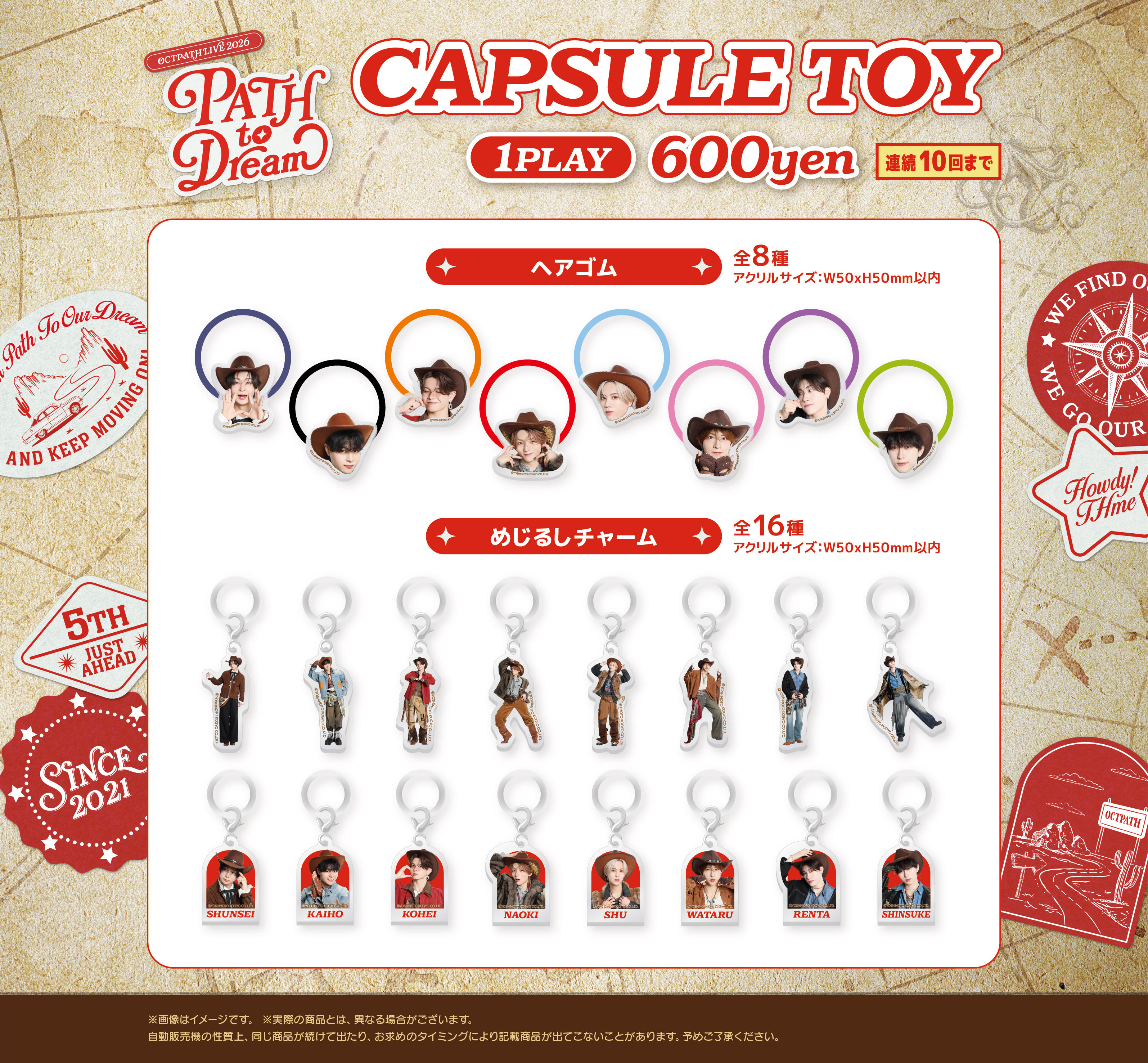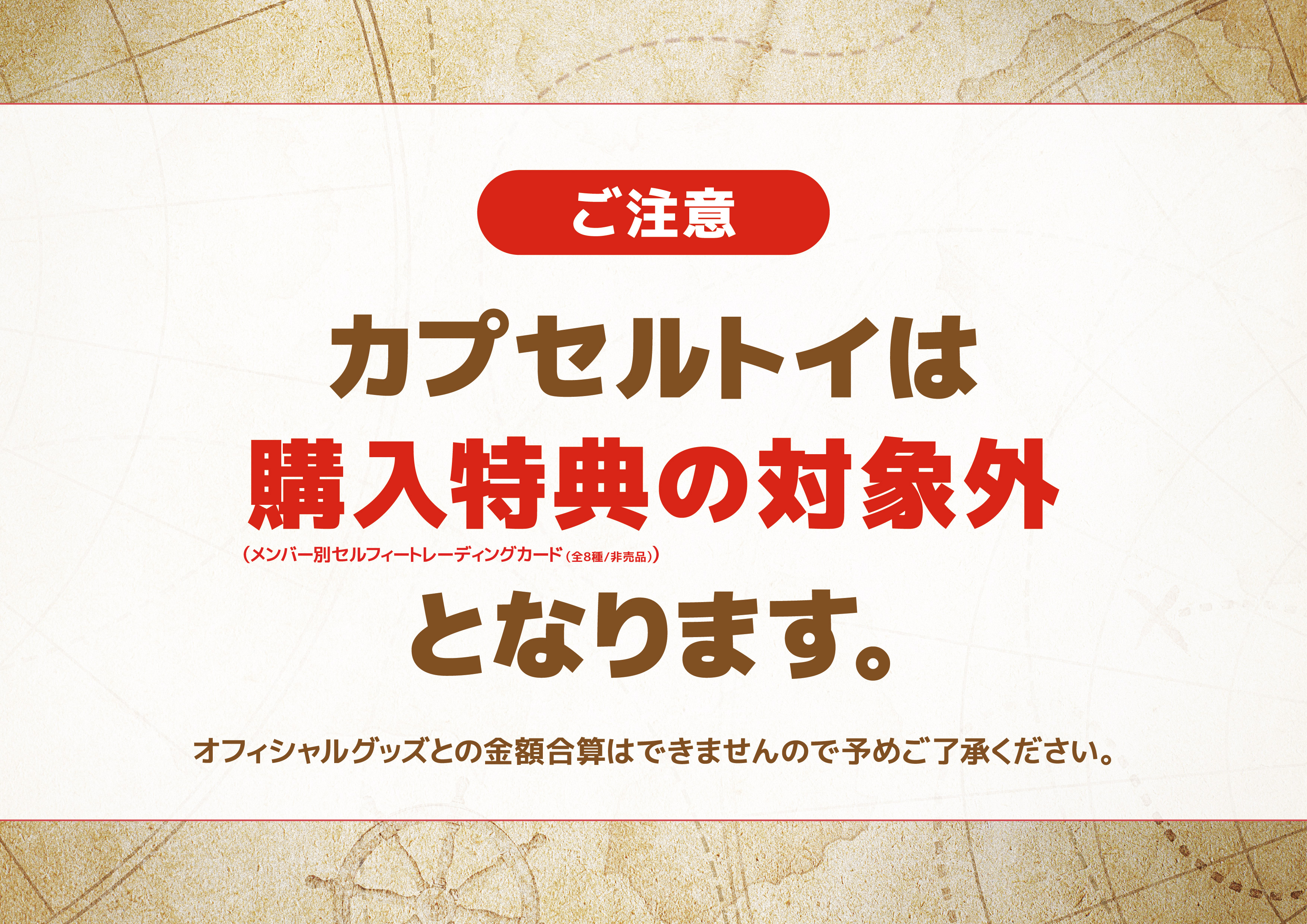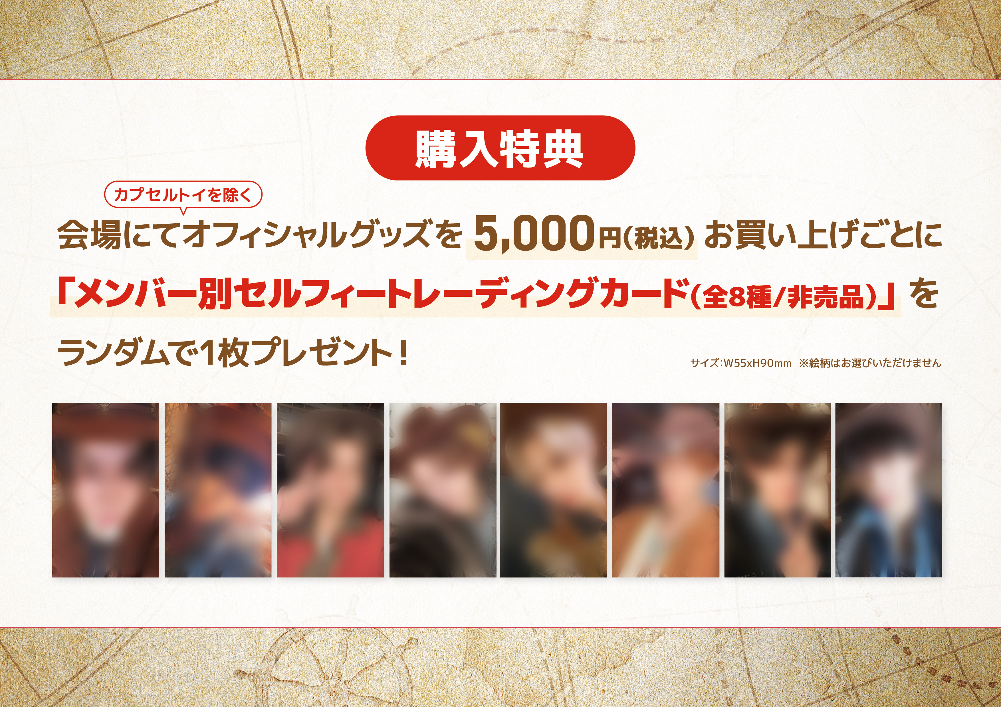 ※会場にてカプセルトイを除くオフィシャルグッズを5,000円(税込)お買い上げごとに「メンバー別セルフィートレーディングカード」(全8種/非売品)」をランダムで1枚プレゼントいたします。
